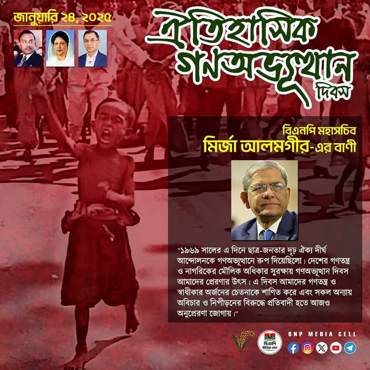 “ঐতিহাসিক গণঅভ্যূত্থান দিবস আমাদের জাতীয় জীবনে এক গুরুত্বপূর্ণ দিন। ১৯৬৯ সালের এ দিনে ছাত্র-জনতার দৃঢ় ঐক্য দীর্ঘ আন্দোলনকে গণঅভ্যূত্থানে রুপ দিয়েছিলো। স্বৈরশাসনের পতনের মধ্য দিয়ে গণতন্ত্র ও স্বাধীনতার দ্বার উন্মুক্ত হয়েছিলো। দেশের গণতন্ত্র ও নাগরিকের মৌলিক অধিকার সুরক্ষায় গণঅভ্যূত্থান দিবস আমাদের প্রেরণার উৎস। এ দিবস আমাদের গণতন্ত্র ও স্বাধীকার অর্জনের চেতনাকে শাণিত করে এবং সকল অন্যায় অবিচার ও নিপীড়নের বিরুদ্ধে প্রতিবাদী হতে আজও অনুপ্রেরণা জোগায়।
