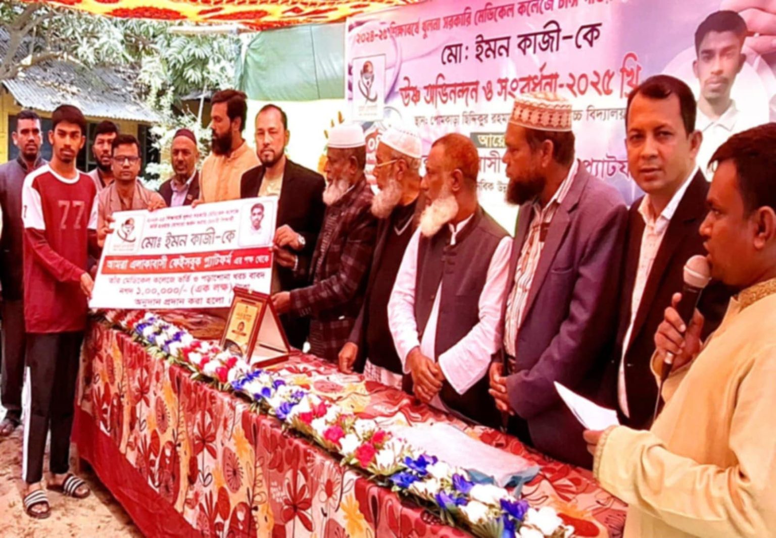 খুলনা মেডিকেলে চান্স পাওয়া সেই ইমন কাজী কে ১ লাখ টাকা অর্থ সহায়তা ও সংবর্ধনা দিলেন স্থানীয় সংগঠন “আমরা এলাকাবাসী ফেইসবুক প্ল্যাটফর্ম””