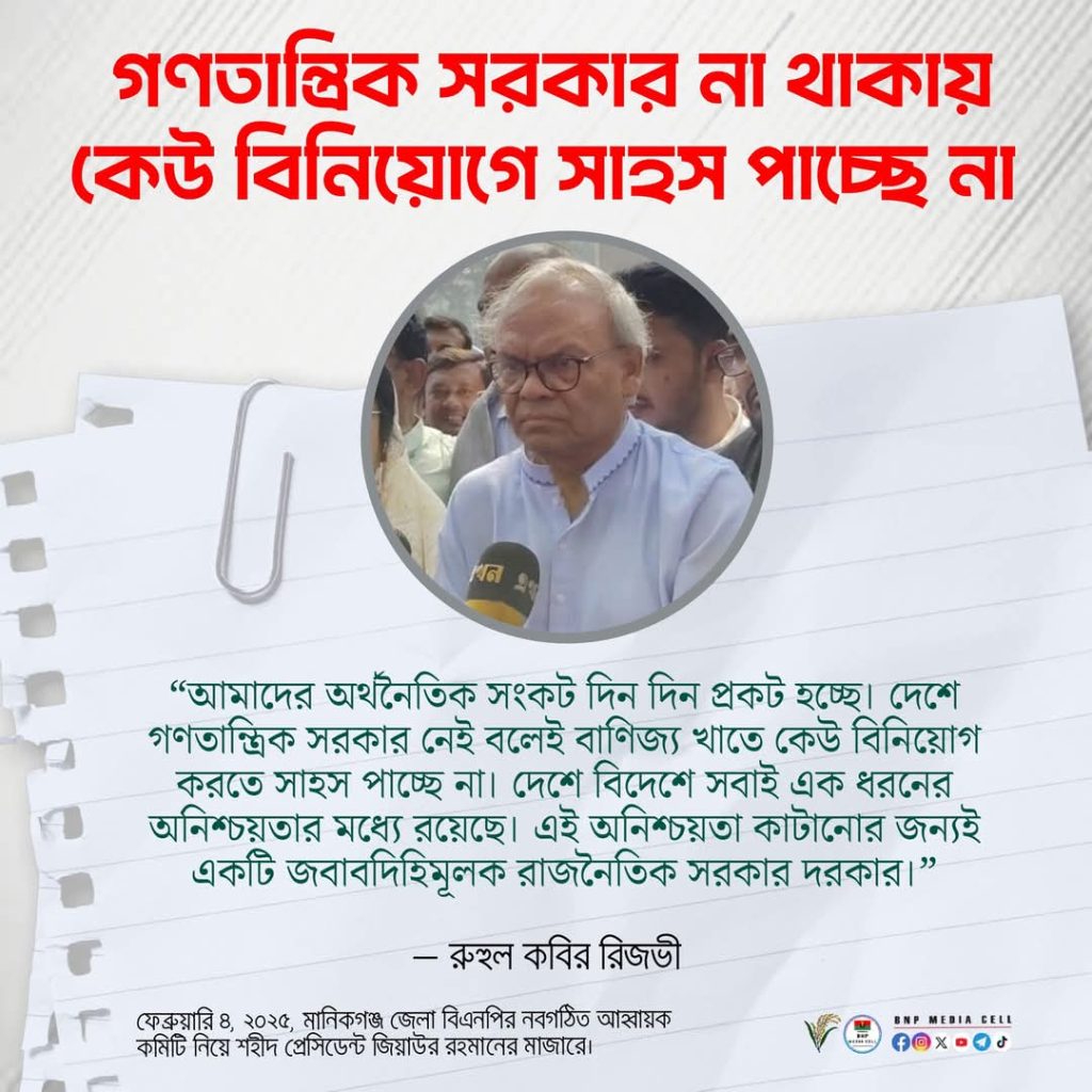 রুহুল কবির রিজভী বলেন, ‘শেখ হাসিনা দেশের জনগণের ক্ষমতা কেড়ে নিয়েছিল। ছাত্র-জনতার রক্ত ঝরা গণ-আন্দোলনে সেই ভয়ংকর ফ্যাসিবাদ শেখ হাসিনা দেশ থেকে পালিয়ে গেছে এবং দেশে গণতন্ত্র প্রতিষ্ঠার পরিবেশ সৃষ্টি হয়েছে। জনগণের ক্ষমতা তাদের কাছে ফিরিয়ে দেওয়ার সময় এসেছে।’