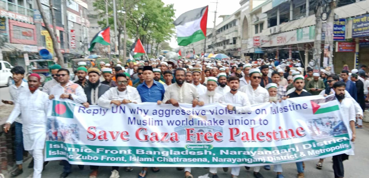 গাজায় ইসরাইলের অব্যাহত গণহত্যার প্রতিবাদে ইসলামিক ফ্রন্ট বাংলাদেশ এর আয়োজনে বিক্ষোভ মিছিল ও প্রতিবাদ সমাবেশ অনুষ্ঠিত হয়।শুক্রবার ১১ এপ্রিল ২০২৫ইং বাদ জুম্মা ইসলামিক ফ্রন্ট বাংলাদেশ এর আয়োজনে এবং ইসলামী যুব ফ্রন্ট ও ইসলামী ছাত্র সেনা এর সার্বিক সহযোগিতায় এ বিক্ষোভ মিছিল ও প্রতিবাদ সমাবেশ অনুষ্ঠিত হয়েছে।বিক্ষোভ মিছিলটি নারায়ণগঞ্জ সিটি কর্পোরেশন সংলগ্ন বাইতুল ইজ্জত জামে মসজিদ প্রাঙ্গণ থেকে শুরু করে নগরীর প্রধান প্রধান সড়ক পদক্ষিন করে নারায়ণগঞ্জ প্রেসক্লাব প্রাঙ্গনে সংক্ষিপ্ত প্রতিবাদ সমাবেশের মাধ্যমে কর্মসূচি পরিসমাপ্তি ঘটে।ইসরায়েল এর বিরুদ্ধে বিশ্ব মুসলিমদের প্রতি ঐক্যবদ্ধভাবে সম্মিলিত প্রতিরোধ গড়ে তোলার আহবান করে ইসলামিক ফ্রন্ট বাংলাদেশ এর কেন্দ্রীয় সাংগঠনিক সচিব(ঢাকা বিভাগ)মো:তরিকুল হাসান লিংকন প্রধান অতিথির গুরুত্বপূর্ণ বক্তব্য প্রদান করেন।