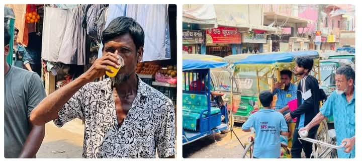 ভ্যানচালক আবু বকর বলেন‘ এই গরমে শরীল না চললেও সংসারের খরচ চালাতে বাধ্য হইয়েই ভ্যান নিয়ে বার হয়েছি। একখান খ্যাপ নিয়ে আইসি এসে দেখি শরবত ও পানি আর স্যালাইন দেওয়া হচ্ছে।আমরা গরিব মানুষ, আমাদের তো সামর্থ্য নাই যে এইগুলো কিনে খাব।