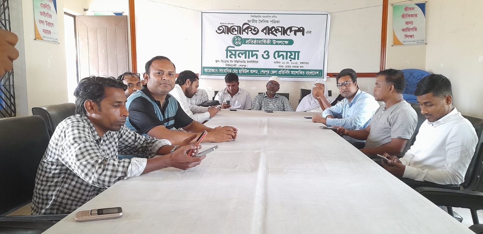 ঢাকা থেকে প্রকাশিত দৈনিক আলোকিত বাংলাদেশ পত্রিকার ১৬তম প্রতিষ্ঠাবার্ষিকী উপলক্ষে ২০ মে মঙ্গলবার দুপুর ২টায় শেরপুর জেলা শহরের প্রাণকেন্দ্র নিউমার্কেট ডিপ্লোমা ইন ইঞ্জিনিয়ারিং ইন্সটিটিউট কার্যালয়ে এক মিলাদ ও দোয়া অনুষ্ঠিত হয়েছে।