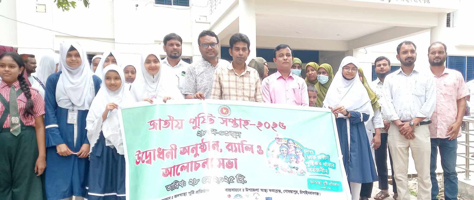 “শিশু থেকে প্রবীণ পুষ্টিকর খাবার সর্বজনীন” এই প্রতিপাদ্যকে সামনে রেখে চাঁপাইনবাবগঞ্জের গোমস্তাপুরে জাতীয় পুষ্টি সপ্তাহ ২০২৫ উপলক্ষে বর্ণাঢ্য র্যালি ও আলোচনা সভা অনুষ্ঠিত হয়েছে।