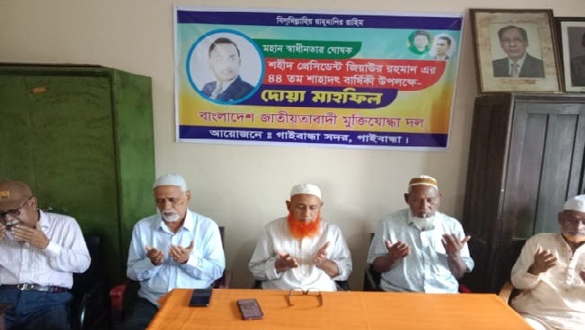 গাইবান্ধা জাতীয়তাবাদী মুক্তিযোদ্ধা দলের আয়োজন শহীদ প্রেসিডেন্ট জিয়াউর রহমানের ৪৪ তম শাহাদাত উপলক্ষে আলোচনা সভা ও দোয়া মাহফিল অনুষ্ঠিত হয়েছে। গাইবান্ধা জজ কোর্টের সরকারি আইনজীবী (জি.পি) বীর মুক্তিযোদ্ধা আলহাজ্ব এডভোকেট আব্দুল মজিদ এর সভাপতিত্বে ও বীর মুক্তিযোদ্ধা শাহজাহান মন্ডলের সঞ্চালনায় আলোচনা সভায় বক্তব্য রাখেন বীর মুক্তিযোদ্ধা ও সাবেক এমপি আলহাজ্ব সাইফুল ইসলাম সাজা, জেলা বিএনপির সাবেক সভাপতি ও বীর মুক্তিযোদ্ধা শেখ সামাদ আজাদ, উপজেলা বিএনপির সভাপতি নুর ইসলাম, বীর মুক্তিযোদ্ধা মজিবর রহমান, বীর মুক্তিযোদ্ধা আজিজার রহমান, বীর মুক্তিযোদ্ধা জবেদ আলী প্রমুখ।