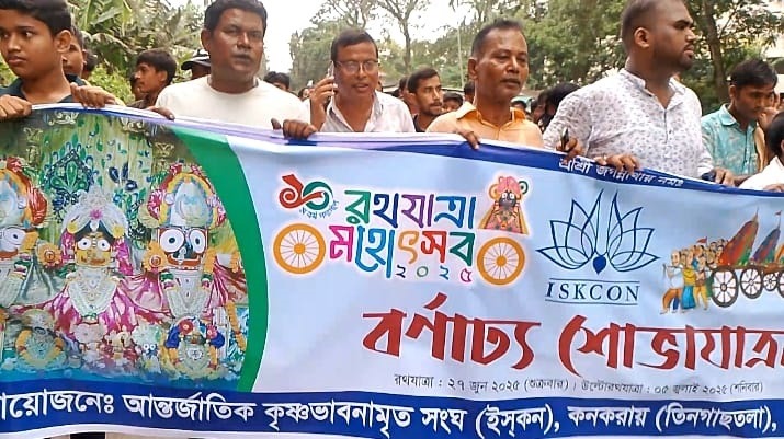 আজ (শুক্রবার, ২৭ জুন) বিকেল ৫টার দিকে কলেজরোডের তিনগাছের তল থেকে একটি বর্ণাঢ্য শোভাযাত্রা বের হয়ে শহরের ভিএইড রোডের কেন্দ্রীয় কালী মন্দির প্রাঙ্গণে এসে শেষ হয়।