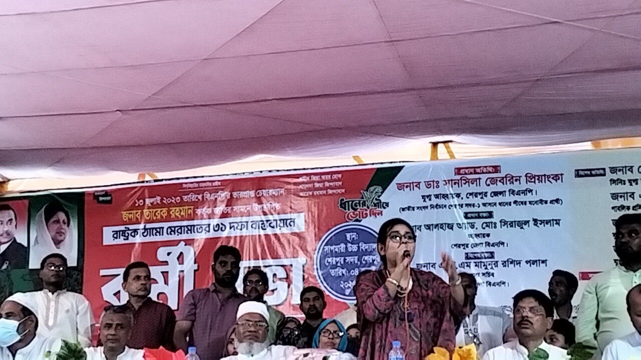 অনুষ্ঠানের প্রধান অতিথি হিসেবে উপস্থিত থেকে দিকনির্দেশনামূলক বক্তব্য প্রদান করেন শেরপুর-১ (সদর) আসনের বাংলাদেশ জাতীয়তাবাদী দল-বিএনপির মনোনীত নেত্রী ও ধানের শীষের কান্ডারী, ডাঃ সানসিলা জেবরিন প্রিয়াংকা। তিনি বেলেন আমি শেরপুরের মানুষের জন্য কাজ করে যাচ্ছি এ কাজ চলমান আছে এবং থাকবে। যদি আমি বিএনপির মনোনীত প্রার্থী হয় তবে আপনারা আমাকে একটিবার সূযোগ দিয়ে দেখবেন আমি শেরপুরের উন্নয়ন করতে পারি কিনা।
