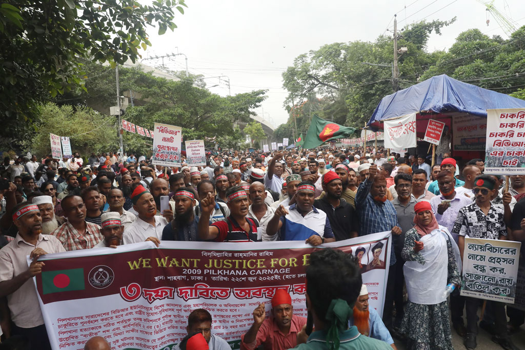 দুই সপ্তাহ ধরে শাহবাগ জাতীয় জাদুঘরের সামনে অবস্থান কর্মসূচি পালন করছেন চাকরিচ্যুত বিডিআর সদস্য ও তাঁদের পরিবারের সদস্যরা। আজ সোমবার সকালেও শাহবাগ জাতীয় জাদুঘরের সামনে জড়ো হন তাঁরা। দাবি পূরণে সকাল ১১টা পর্যন্ত সরকারকে আল্টিমেটাম দেন তাঁরা। দাবি মেনে না নেওয়ায় বেলা সাড়ে ১১টায় শাহবাগ জাতীয় জাদুঘরের সামনে থেকে যমুনার অভিমুখে পদযাত্রা শুরু হয়।