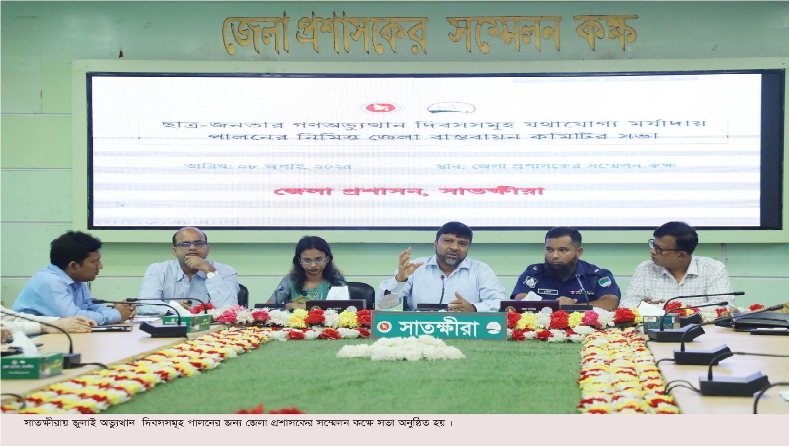 ছাত্র-জনতার গণঅভ্যুত্থান দিবসসমূহ যথাযোগ্য মর্যাদায় পালনের নিমিত্ত সাতক্ষীরা জেলা বাস্তবায়ন কমিটির সভা অনুষ্ঠিত হয়েছে। মঙ্গলবার (০৮ জুলাই) বিকেলে জেলা প্রশাসক সম্মেলন কক্ষে অনুষ্ঠিত সভায় সভাপতিত্ব করেন সাতক্ষীরার জেলা প্রশাসক মোস্তাক আহমেদ। সভায় বক্তব্য রাখেন স্থানীয় সরকার বিভাগ সাতক্ষীরার উপ-পরিচালক মাশরুবা ফেরদৌস, সিভিল সার্জন ডাঃ আব্দুস সালাম, অতিরিক্ত জেলা প্রশাসক (সার্বিক) বিষ্ণুপদ পাল, অতিরিক্ত পুলিশ সুপার মুকিত হাসান খাঁন, জেলা জামায়াতের আমীর শহিদুল ইসলাম মুকুল, জেলা তথ্য অফিসার জাহারুল ইসলাম, সাতক্ষীরা প্রেসক্লাবের সভাপতি আবুল কাসেম, বৈষম্যবিরোধী ছাত্র আন্দোলনের জেলা আহবায়ক আরাফাত হোসেন, মুখপাত্র মোহিনী তাবাসসুম প্রমুখ।
