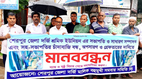 শেরপুরে পোষাক তৈরি দর্জি মালিক সমিতির সদস্য ও সৌদি টেইলার্স এন্ড ফেব্রিক্স এর মালিক মো. সোহেল রানার কাছে গত ৬ জুলাই দর্জি শ্রমিক ইউনিয়নের সভাপতি আল মামুন ও একই সংগঠনের সাধারণ সম্পাদক রহিজ মিয়া কর্তৃক ১০ হাজার টাকা চাঁদা দাবি ও হুমকি দেয়ার প্রতিবাদে মানববন্ধন কর্মসূচি পালন করেছে দর্জি মালিক সমিতির সদস্যরা। ৯ জুলাই বুধবার দুপুরে জেলা প্রশাসকের কার্যালয় গেইটে এ মানববন্ধন কর্মসূচি পালন করেন। মানববন্ধন কর্মসূচিতে আসা সৌদি টেইলার্সের মালিক সোহেল রানা জানান, শেরপুর জেলা দর্জি শ্রমিক ইউনিয়নের সভাপতি মো. আল মামুন ও সাধারণ সম্পাদক মো. রহিজ মিয়া পর্যায়ক্রমে আমার টেইলার্সে থাকা শ্রমিকদের কাজ না করার জন্য বলেন। এছাড়াও আমাকে ১০ হাজার টাকা চাঁদার জন্য চাপ দিতে থাকেন এবং হুমকি প্রদর্শন করে। এঘটনা আমি দর্জি মালিক সমিতির নেতৃবৃন্দদের অবহিত করি পরে তারা শ্রমিক ইউনিয়নের সভাপতি এবং সাধারণ সম্পাদকের বিরুদ্ধে তদন্ত সাপেক্ষে আইনগত ব্যবস্থা নেয়ার জন্য এক মানববন্ধন কর্মসূচি পালন করেন।