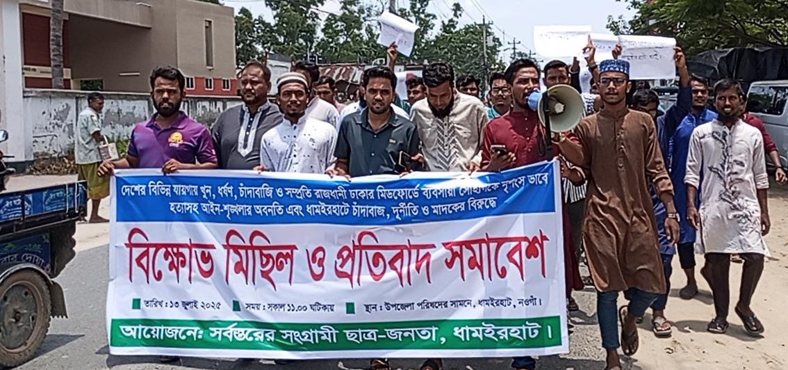 নওগাঁর ধামইরহাটে সর্বস্তরের ছাত্র জনতার আয়োজনে বিক্ষোভ মিছিল ও প্রতিবাদ সমাবেশ অনুষ্ঠিত হয়েছে।