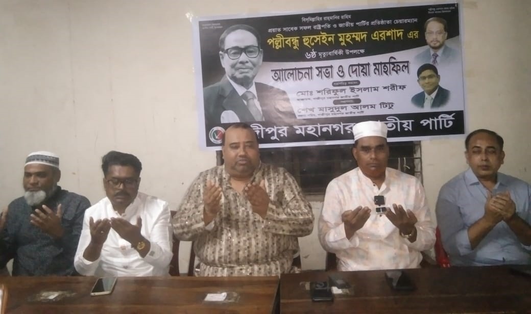 ১৪ জুলাই ২০২৫ ইং রোজ সোমবার বিকাল ৪ ঘটিকায় গাজীপুর মহানগর জাতীয় পার্টির উদ্দোগে শহরের চান্দনা চৌরাস্তা আলহাজ্ব আইনউদ্দিন সরকার মাদ্রাসা হল রুমে আলোচনা সভা ও দোয়া মাহফিল অনুষ্ঠিত হয়।