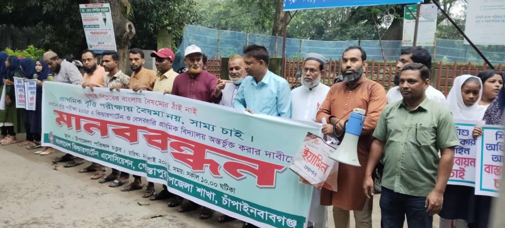 জুলাই বিপ্লবের বাংলায় বৈষম্যের ঠাই নাই, প্রাথমিক বৃত্তি পরীক্ষায় বৈষম্য নয়, সাম্য চায় এই প্রতিপাদ্যকে সামনে রেখে চাঁপাইনবাবগঞ্জের গোমস্তাপুরে প্রাথমিক বৃত্তি পরীক্ষা-২০২৫ এ কিন্ডারগার্টেন ও বে-সরকারি প্রাথমিক বিদ্যালয়গুলোকে অন্তর্ভুক্ত করার দাবিতে এক মানববন্ধন অনুষ্ঠিত হয়। বৃহস্পতিবার (২৪ জুলাই) সকাল ১০টায় উপজেলা পরিষদ চত্বরে এ মানববন্ধন অনুষ্ঠিত হয়।