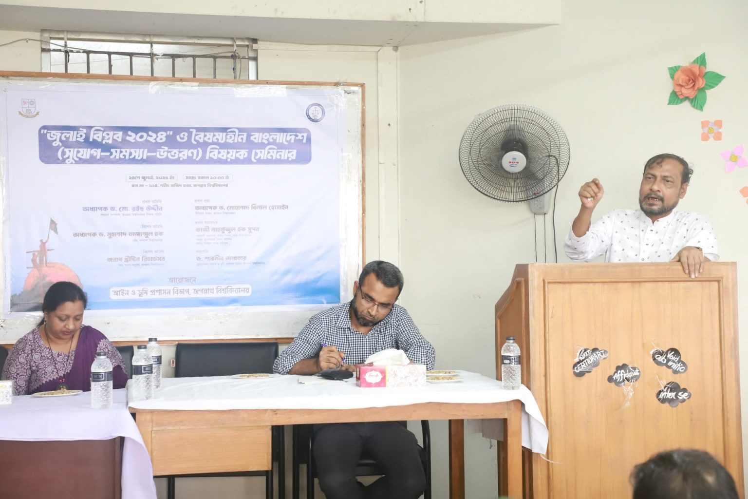 জুলাই বিপ্লব ২০২৪ উদযাপন উপলক্ষে সেমিনার আয়োজন করেছে জগন্নাথ বিশ্ববিদ্যালয়ের (জবি) আইন ও ভূমি প্রশাসন বিভাগ।
