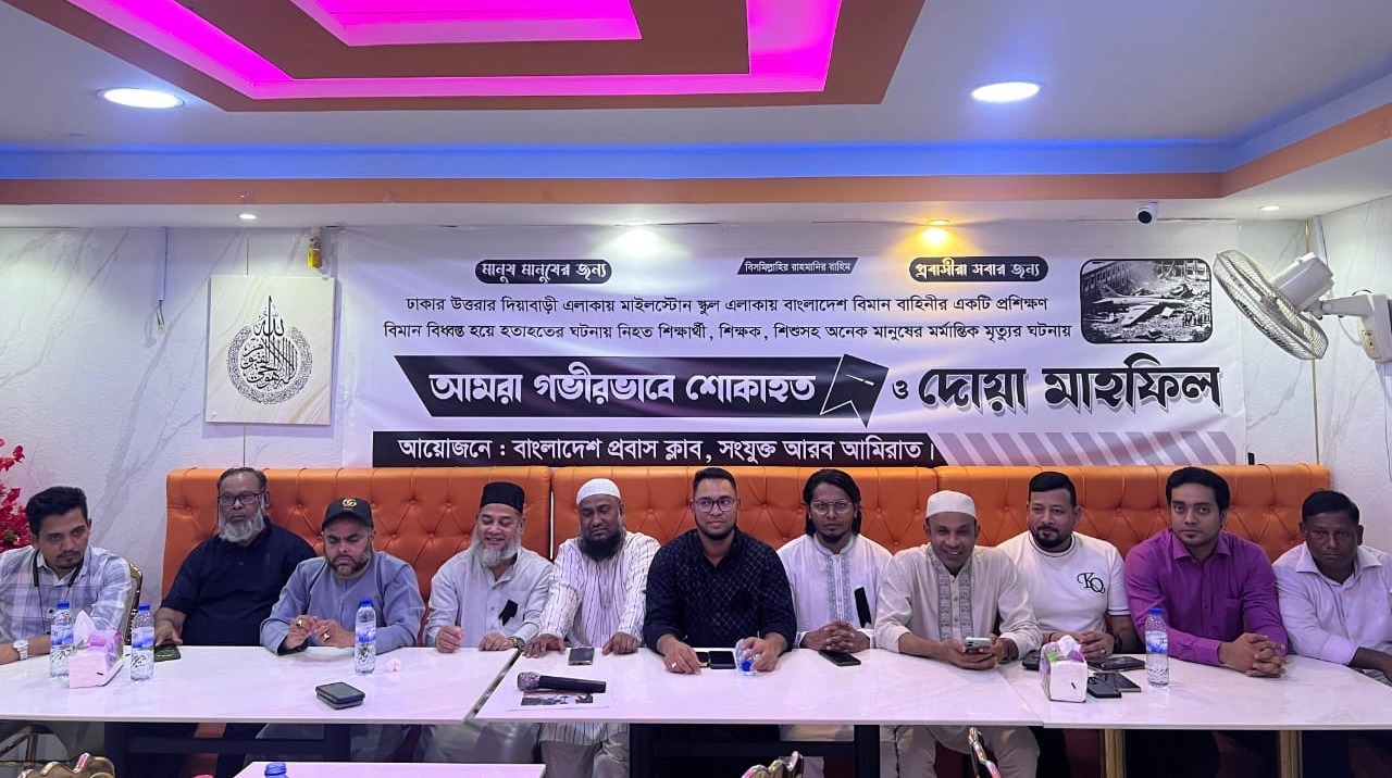 দুবাইতে ঢাকার দিয়া বাড়ি উত্তরার মাইলস্টোন স্কুল অ্যান্ড কলেজে বিমান বাহিনীর প্রশিক্ষণ বিমান দুর্ঘটনায় স্কুল ছাত্র/ছাত্রী, শিক্ষক / শিক্ষিকা ও অবিভাবক ও পাইলট তৌকিরসহ নিহতদের আত্মার মাগফিরাত ও আহতদের সুস্থতা কামনা করে “বাংলাদেশ প্রবাস ক্লাব ইউএই”এর উদ্যোগে শোক সভা ও দোয়া মাহফিল অনুষ্ঠিত হয়।