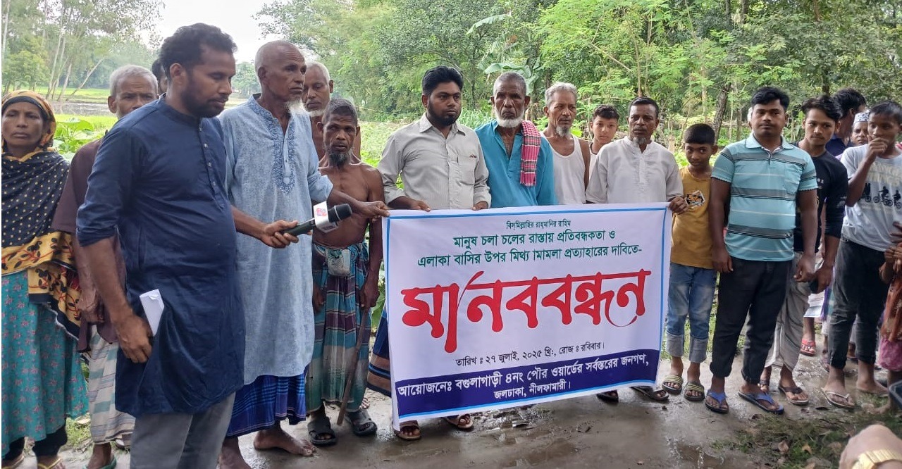নীলফামারীর জলঢাকা পৌরসভার ৪ নম্বর ওয়ার্ডের বগুলা গাড়ি এলাকায় সরকারি আইডি করা চলাচলের রাস্তা দখল করে ইউকালিপ্টাস গাছ লাগানোর ঘটনায় এবং এলাকাবাসীর ওপর মিথ্যা মামলা দায়েরের প্রতিবাদে মানববন্ধন অনুষ্ঠিত হয়েছে।