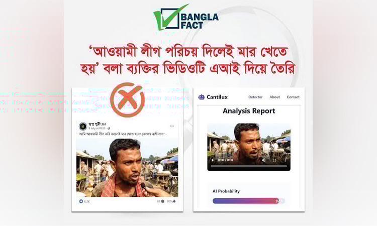কৃত্রিম বুদ্ধিমত্তা বা এআইয়ের সাহায্যে তৈরি একটি ভিডিওকে বাস্তব দাবি করে সামাজিক যোগাযোগমাধ্যমে ছড়ানো হয়েছে। তবে সেটিকে মিথ্যা বলে শনাক্ত করেছে প্রেস ইনস্টিটিউট বাংলাদেশ (পিআইবি)-এর ফ্যাক্টচেক ও মিডিয়া রিসার্চ টিম বাংলাফ্যাক্ট।