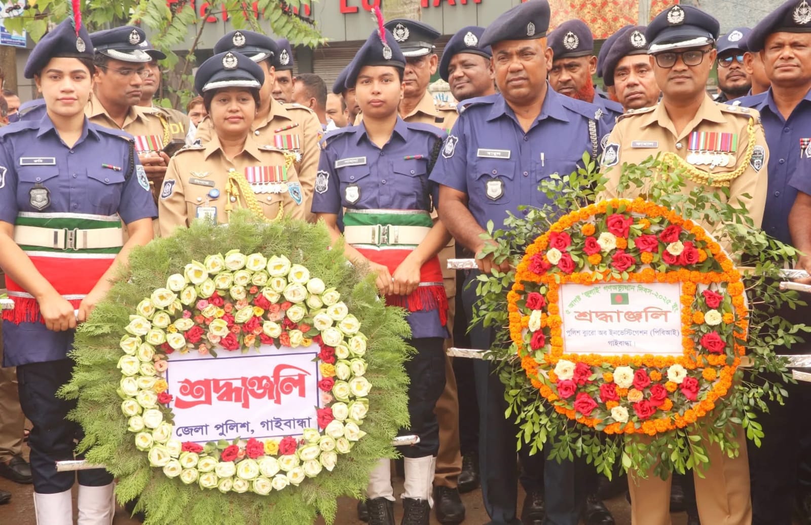 অদ্য ০৫ ই আগস্ট ২০২৫ খ্রিস্টাব্দ “জুলাই গণঅভ্যুত্থান দিবস” উপলক্ষে গাইবান্ধা পৌর পার্কে জুলাই শহিদ স্মৃতিস্তম্ভে গাইবান্ধা জেলা পুলিশের পক্ষ থেকে গাইবান্ধা জেলার সুযোগ্য পুলিশ সুপার জনাব নিশাত এ্যঞ্জেলা মহোদয় জুলাই গনঅভ্যুত্থানে অংশগ্রহণকারী সকল বীর সৈনিক ও শহীদদের প্রতি শ্রদ্ধা নিবেদন পূর্বক পুষ্পস্তবক অর্পণ করেন।