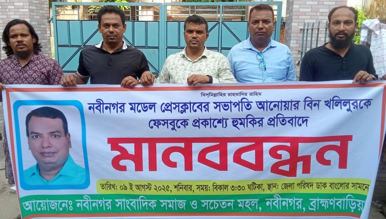 ব্রাহ্মণবাড়িয়ার নবীনগরের বিদ্যাকুট ইউনিয়নের উরখুলিয়া গ্রামে খালের মাটি বেআইনিভাবে বিক্রি করার নিউজ করায় নবীনগর মডেল প্রেস ক্লাবের সভাপতি আনোয়ার বিন খলিলুরকে ফেসবুক মেসেঞ্জারে মাজেদুল হক নামে অজ্ঞাত ব্যক্তির হুমকির প্রতিবাদে মানববন্ধন অনুষ্ঠিত হয়েছে।