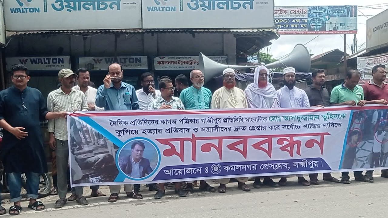 গাজীপুরে প্রতিদিনের কাগজ পত্রিকার স্টাফ রিপোর্টার আসাদুজ্জামান তুহিনকে প্রকাশ্যে কুপিয়ে হত্যার প্রতিবাদে লক্ষ্মীপুরের কমলনগরে মানববন্ধন করা হয়েছে।