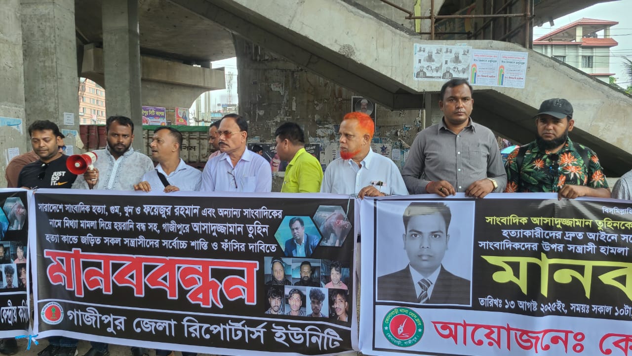 গাজীপুরে ধারালো অস্ত্রের আঘাতে সাংবাদিক আসাদুজ্জামান তুহিন নিহত হওয়ার পর তার হত্যাকারীদের দ্রুত বিচার এবং সর্বোচ্চ শাস্তি কার্যকর করার দাবিতে মানববন্ধন অনুষ্ঠিত হয়েছে। পাশাপাশি, সারাদেশে সাংবাদিকদের ওপর হামলা ও মিথ্যা মামলায় হয়রানির প্রতিবাদ জানানো হয়।