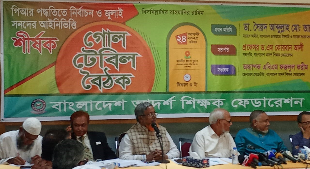বাংলাদেশ আদর্শ শিক্ষক ফেডারেশন কর্তৃক আয়োজিত পি আর পদ্ধতিতে নির্বাচন ও জুলাই সনদের আইনি ভিত্তি শীর্ষক গোল টেবিল বৈঠকের প্রধান অতিথি ডাক্তার সৈয়দ আব্দুল্লাহ মোহাম্মদ তাহের। নায়েবে আমির বাংলাদেশ জামাত ইসলাম। প্রধান অতিথি আব্দুল্লাহ মোহাম্মদ তাহের বলেন বাংলাদেশ জুলাই বিপ্লব সংঘটিত হলো কিন্তু এর কোন আইনি বাস্তবতা এ পর্যন্ত হলো না।