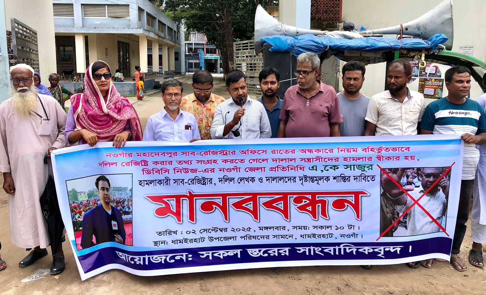 এরই প্রতিবাদে ০২ সেপ্টেম্বর সকাল ১০ টায় ধামইরহাট উপজেলা পরিষদের সামনে সর্বস্তরের সাংবাদিকদের মানববন্ধন অনুষ্ঠিত হয়। এসময় সাংবাদিক মাসুদ সরদার এর সঞ্চালনায় সাংবাদিক নূরুল ইসলাম এর সভাপতিত্বে বক্তব্য রাখেন সাংবাদিক এম এ মালেক, ধামইরহাট প্রেসক্লাবের সহ সভাপতি মোসাদ্দেকুর ইসলাম, সাংগঠনিক সম্পাদক শহিদুল ইসলাম, সাংবাদিক শাহিনা ইয়াসমিন, সাংবাদিক নূর সাঈদ, পত্নীতলা সাংবাদিক মাহমুদুন্নবী সহ আরো অনেকে উপস্থিত ছিলেন।