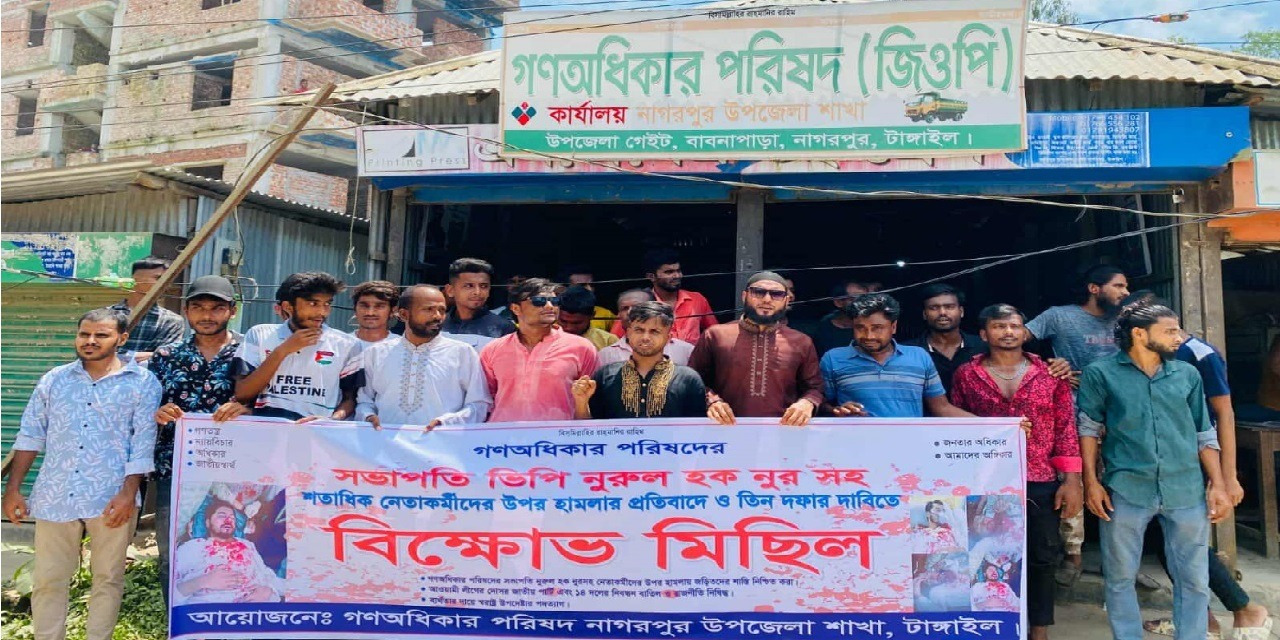 বাংলাদেশ গণ অধিকার পরিষদের সভাপতি নুরুল হক নুরসহ শতাধিক নেতাকর্মীর উপর হামলার প্রতিবাদে ৩ দফা দাবিতে টাঙ্গাইলের নাগরপুরে বিক্ষোভ মিছিল অনুষ্ঠিত হয়েছে।