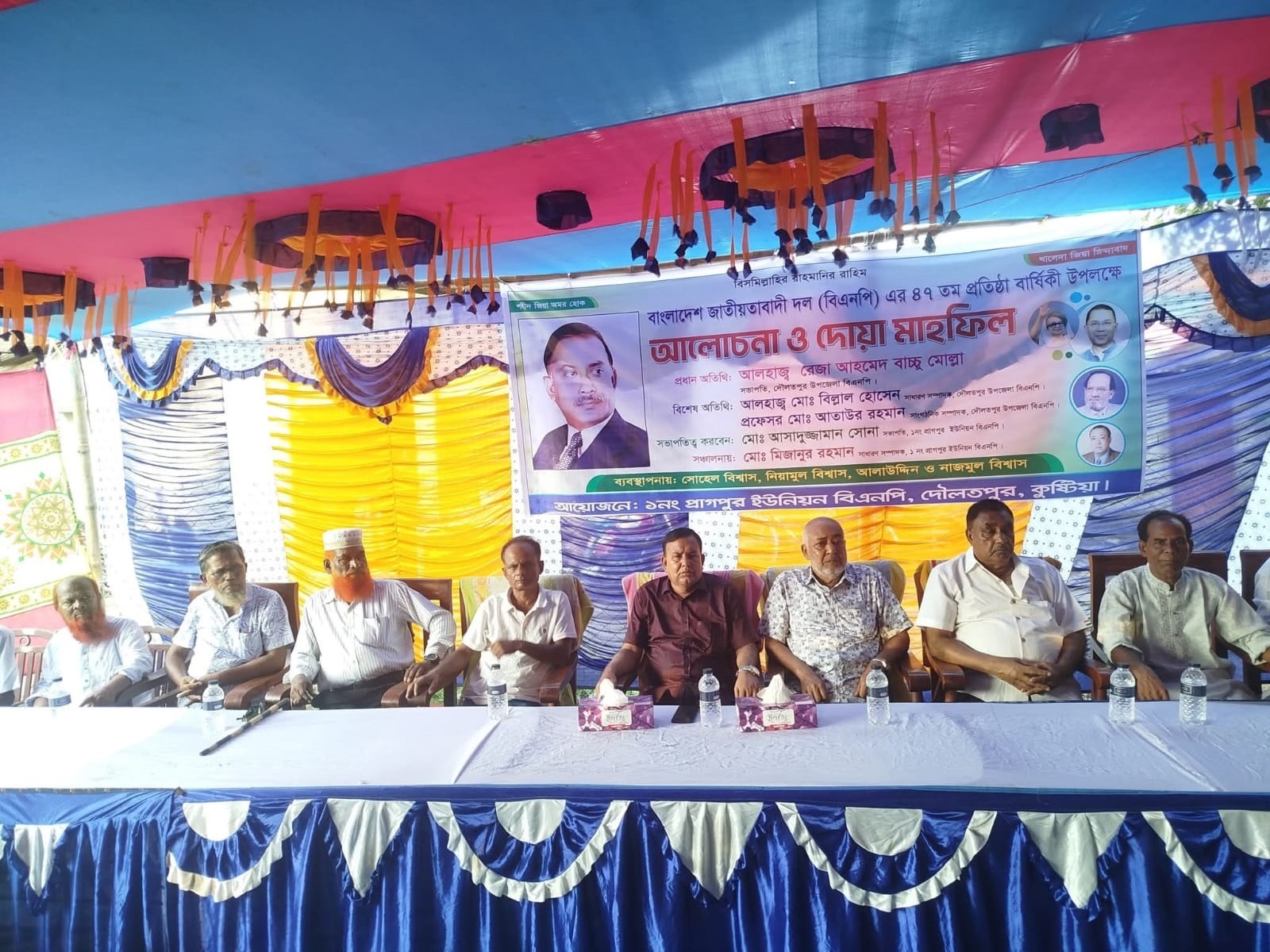 কুষ্টিয়া দৌলতপুর উপজেলার বাংলাদেশ জাতীয়তাবাদী দল বিএনপির ৪৭ তম প্রতিষ্ঠা বার্ষিকী উপলক্ষে শনিবার বিকাল ৪টার সময় প্রাগপুর ইউনিয়ানে আলোচনা ও দোয়া মাহফিল অনুষ্ঠিত হয়েছে।