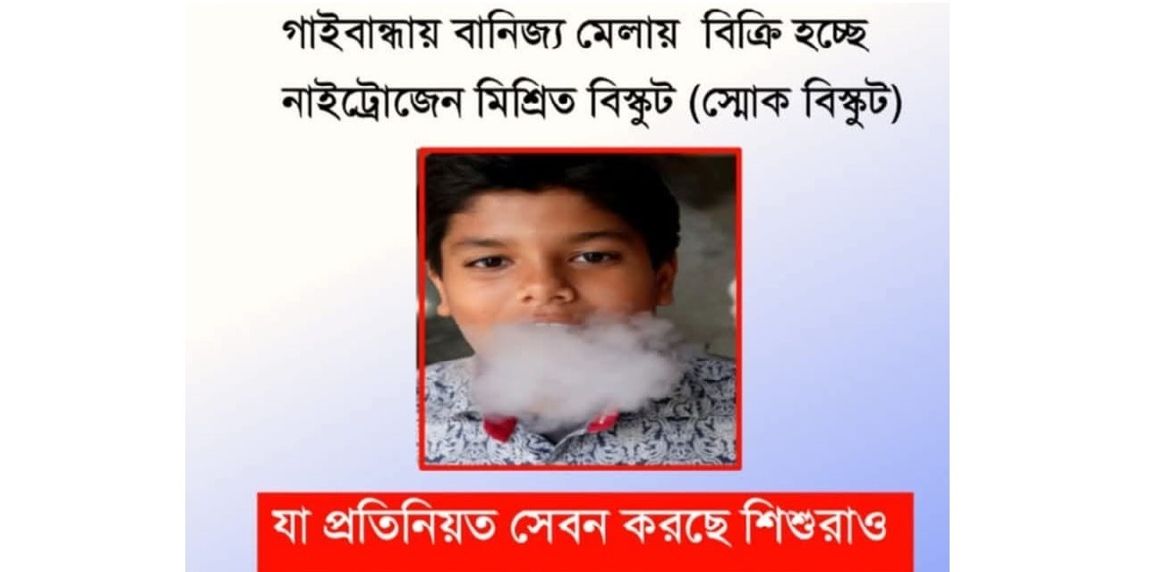 গাইবান্ধায় শিল্প ও বানিজ্য মেলায় নাইট্রোজেন মিশ্রিত (স্মোকিং বিস্কুট) বিক্রি হচ্ছ। অনেক অনেক শিশু এই খাবারের প্রতি আকৃষ্ট হচ্ছে, অনেক অভিভাবকরাই জানেন না যে এই নাইট্রোজেন মিশ্রিত বিস্কুট খেলে মারাত্মক স্বাস্থ্য ঝুকিতে পড়তে পারে বাচ্চারা।