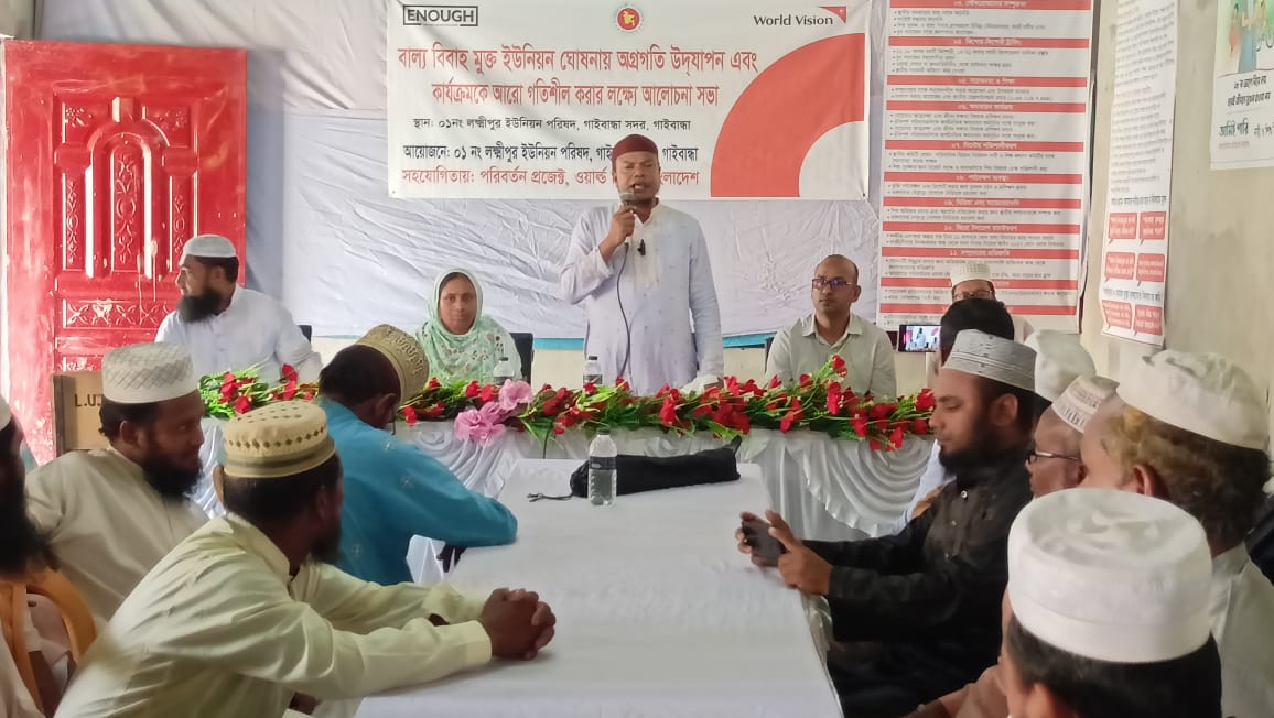 গাইবান্ধা সদর উপজেলায় ১নং লক্ষ্মীপুর ইউনিয়ন পরিষদের আয়োজনে ও পরিবর্তন প্রজেক্ট, ওয়ার্ল্ড ভিশন বাংলাদেশের সহযোগিতায় বাল্য বিবাহ মুক্ত ইউনিয়ন ঘোষনায় অগ্রগতি উদযাপন এবং কার্যক্রমকে আরো গতিশীল করার লক্ষ্যে আলোচনা সভা লক্ষ্মীপুর ইউনিয়ন পরিষদ হল রুমে অনুষ্ঠিত হয়েছে।