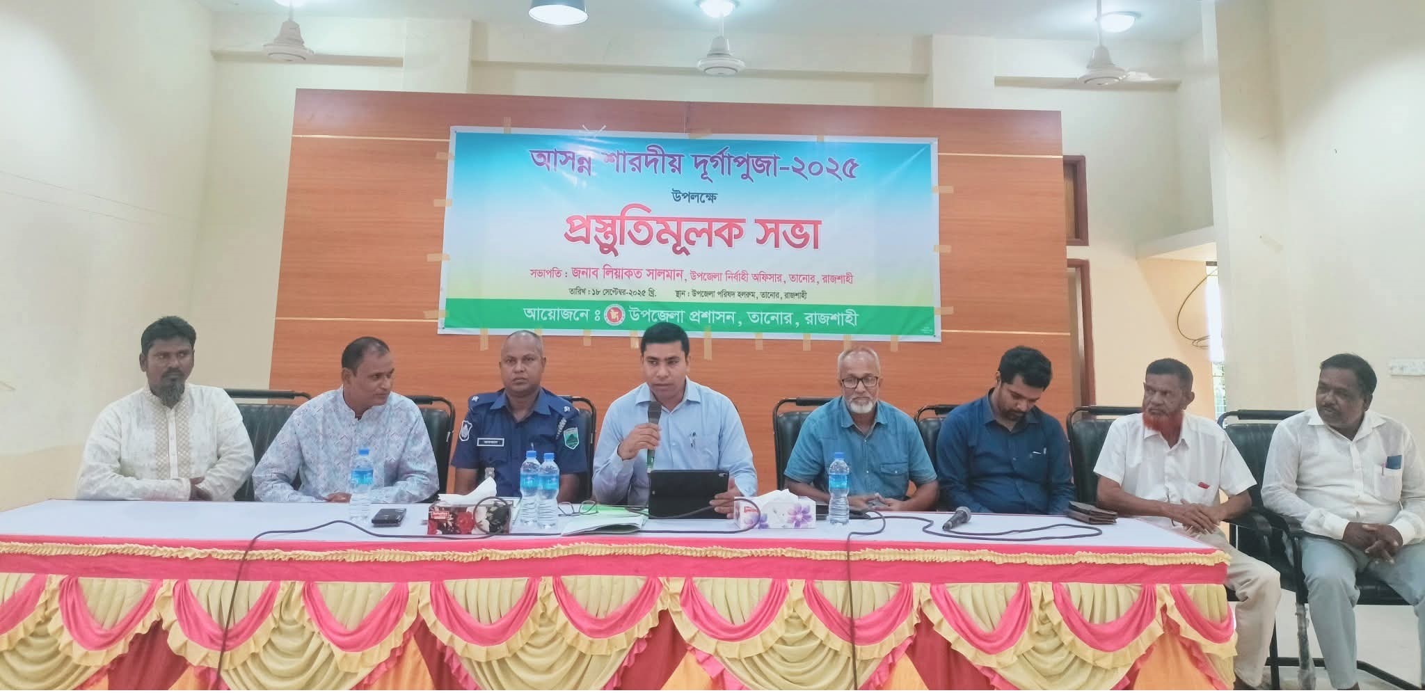 আসন্ন শারদীয় দুর্গাপূজা-২০২৫ উদযাপন উপলক্ষে তানোর উপজেলা প্রশাসনের আয়োজনে প্রস্তুতিমূলক সভা অনুষ্ঠিত হয়েছে। বৃহস্পতিবার সকাল ১১টায় উপজেলা মিলনায়তনে এ সভা হয়।
