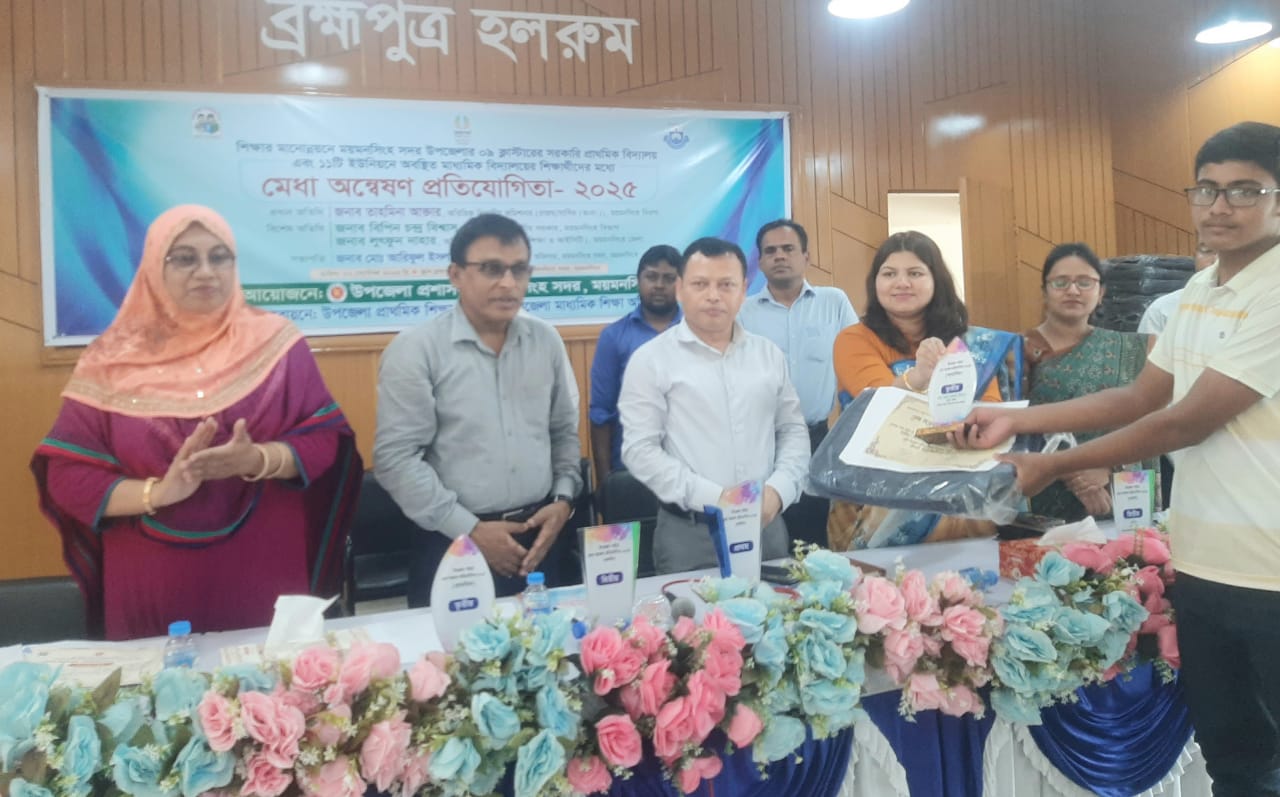 শিক্ষার মানোন্নয়নে ময়মনসিংহ সদর উপজেলার ৯ক্লাস্টারের সরকারি প্রাথমিক বিদ্যালয় এবং ১১ইউনিয়নে অবস্থিত মাধ্যমিক বিদ্যালয়ের শিক্ষার্থীদের মাঝে মেধা অন্বেষণ প্রতিযোগিতা-২০২৫ এর উপজেলা পর্যায়ে নির্বাচিত সেরা মেধাবীদের মাঝে পুরস্কার বিতরণ করা হয়েছে।