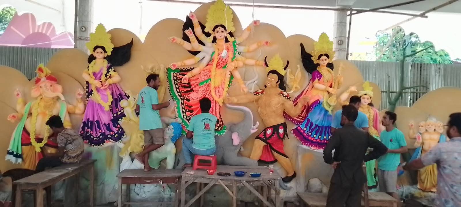 শহরের ভি এইচ রোড কালী মন্দিরে এক অন্যরকম দৃশ্য। প্রতিমাশিল্পীরা ব্যস্ত সময় পার করছেন প্রতিমার গায়ে তুলির শেষ আঁচড়ে। দেবী দুর্গা ও অন্যান্য প্রতিমায় রঙের পরশ পড়তেই যেন প্রাণ ফিরে পেয়েছে মূর্তিগুলো। দূর থেকে ভেসে আসছিল ঢাক-ঢোলের শব্দ, চারপাশে ছড়িয়ে পড়েছে উৎসবের আমেজ।