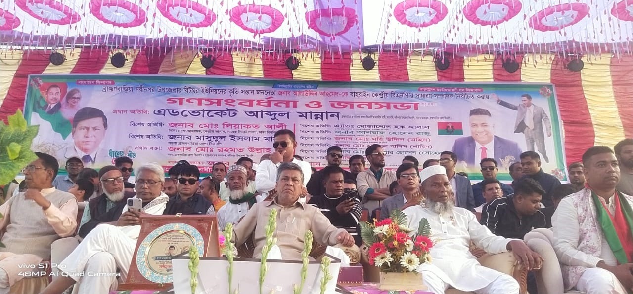 ব্রাহ্মণবাড়িয়া,নবীনগর উপজেলার বিটঘর ইউনিয়নের রাধানাথ উচ্চ বিদ্যালয় মাঠ প্রাঙ্গণে গণ সংবর্ধনা ও আলোচনা সভায় এডভোকেট এম এ মান্নান বলেন আমার সাথে ধানের শীষের অনেকেই নমিনেশন চেয়েছেন। তারা কেউ আমার সহযোদ্ধা, বন্ধু, বড় ভাই, ছোট ভাই। আমার দীর্ঘ রাজনৈতিক ত্যাগের কারনে আমি নমিনেশন পেয়েছি। আমি সবাইকে আহবান করবো ধানের শীষকে বিজয়ী করতে, শহীদ রাষ্ট্রপতি জিয়াউর রহমানের দলকে বিজয়ী করতে ঐক্যবদ্ধ হয়ে কাজ করি। আপনারা আমার ভাই, আমাদের দল আমাকে মূল্যায়ন করেছে। আমি কৃতজ্ঞতা জানাই আমার দলের ভারপ্রাপ্ত চেয়ারম্যান তারেক রহমানসহ দলের সকলকে, বলে বক্তব্য প্রদান করেন ব্রাহ্মণবাড়িয়া ৫, নবীনগরের ধানের শীষের মনোনয়ন প্রাপ্ত এডভোকেট এম এ মান্নান।