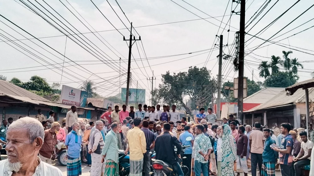 রোববার বেলা ১১টার দিকে উপজেলার অডিটরিয়াম চত্বর এলাকায় ‘মেসার্স মোর্শেদ সার ঘর’-এর সামনে মহাসড়ক অবরোধ করেন তাঁরা।
