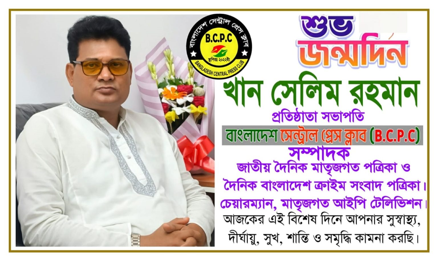 আজ ১১ ডিসেম্বর ২০২৫—জাতীয় দৈনিক মাতৃজগত পত্রিকার সম্পাদক, বাংলাদেশ সেন্ট্রাল প্রেস ক্লাব (B.C.P.C.)-এর প্রতিষ্ঠাতা সভাপতি, দেশবরেণ্য সংগঠক ও মানবতার ফেরিওয়ালা খান সেলিম রহমানের শুভ জন্মদিন।