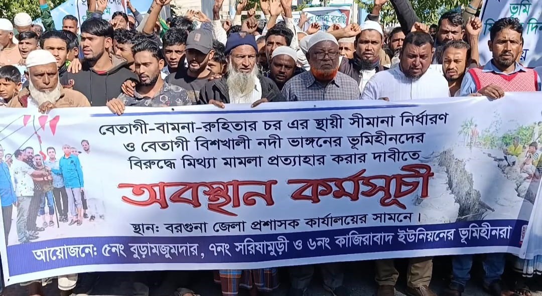 বরগুনায় জেলা প্রশাসক কার্যালয়ের সামনে অবস্থান কর্মসূচি পালন করেন বেতাগী উপজেলার পাঁচশতাধিক ভূমিহীনরা। বিষ খালি নদীর মধ্যে গড়ে ওঠা রুহিতার চর নিয়ে বামনা ও বেতাগী দুই উপজেলার মধ্যে দীর্ঘদিন ধরে বিবাদ চলছে। বেতাগীর তিনটি ইউনিয়ন থেকে অবস্থান কর্মসূচিতে আসা নারী পুরুষরা বলেন তাদের রেকর্ডীয় সম্পত্তি নদী ভাঙ্গনে বিষ খালির গর্বে চলে যায়। পরবর্তীতে নদীর মাঝে গড়ে ওঠে রুহিতার চর। সেই চরে দীর্ঘদিন তারা চাষাবাদ করলেও ২০২৪ সালে বামনা উপজেলা চর সংলগ্ন স্থানীয় বাসিন্দারা তাদের বাধা দেয়। চলতি বছরের মার্চ মাসে প্রশাসনের মাধ্যমে দুই উপজেলার সীমানা নির্ধারণ করে দেয়া হয়। এরপর তারা চাষাবাদ করলে তাদের ধান কেটে নিয়ে যাওয়ার অভিযোগ করা হয়। দেয়া হয় তাদের বিরুদ্ধে একাধিক মামলা।