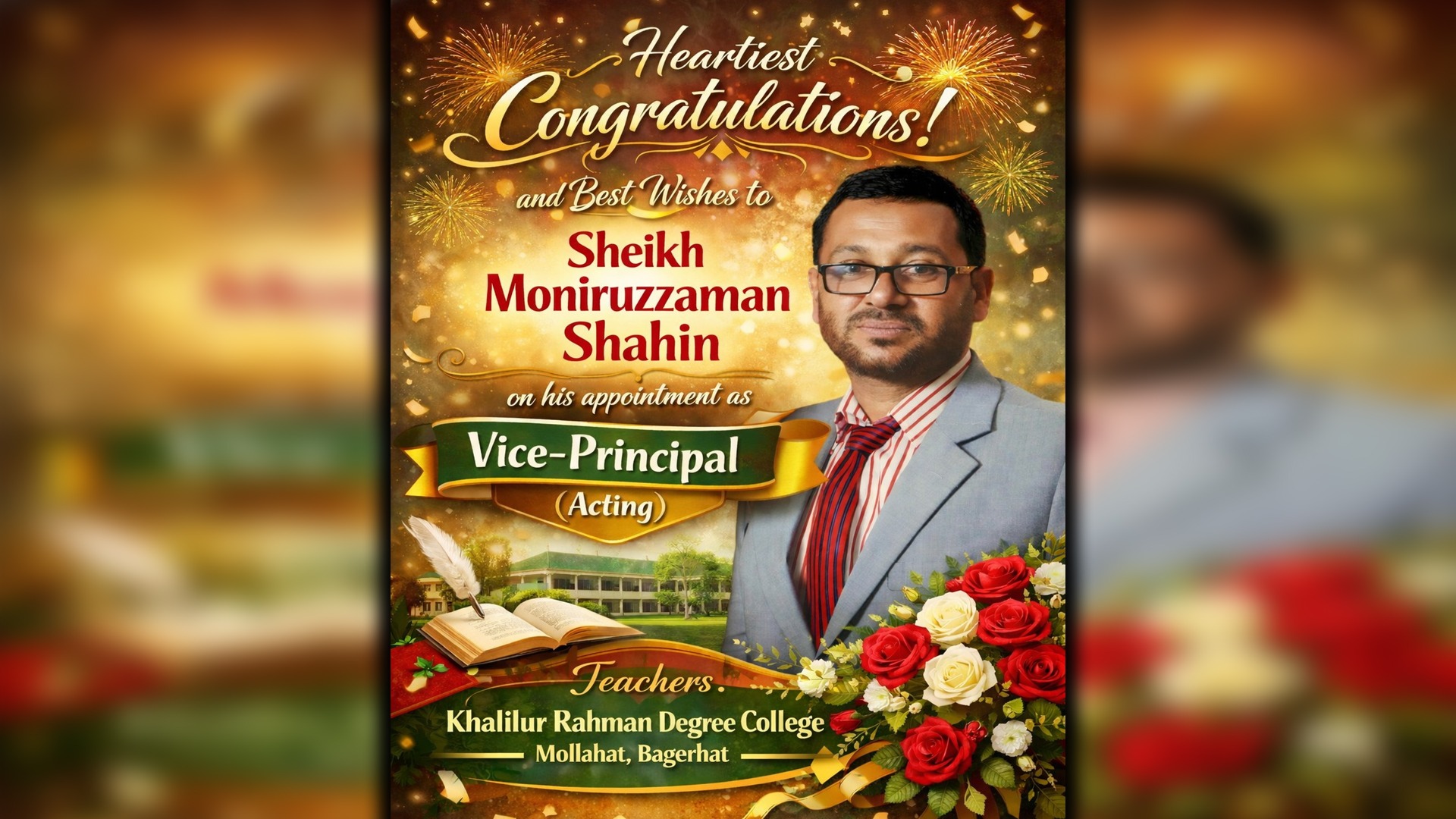 বাগেরহাট জেলার মোল্লাহাট উপজেলার ঐতিহ্যবাহী শিক্ষা প্রতিষ্ঠান মোল্লাহাট খলিলুর রহমান ডিগ্রি কলেজের ভারপ্রাপ্ত ভাইস প্রিন্সিপাল হিসেবে দায়িত্বপ্রাপ্ত হওয়ায় শেখ মনিরুজ্জামান শাহীন-কে অভিনন্দন ও শুভেচ্ছা জানিয়েছেন বিভিন্ন রাজনৈতিক, সামাজিক, শিক্ষানুরাগী ও সুধী মহল।