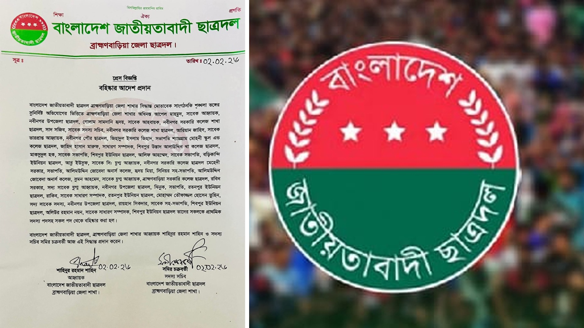 আলিমউদ্দিন জোবেদা অনার্স কলেজের সভাপতি মেহেদী সরকার, আলিমউদ্দিন জোবেদা অনার্স কলেজের সিনিয়র সহ-সভাপতি হৃদয় মিয়া, ব্রাহ্মণবাড়িয়া সরকারি কলেজ ছাত্রদলের সাবেক যুগ্ম আহ্বায়ক সুমন আহমেদ, নবীনগর উপজেলা ছাত্রদলের সদ্য সাবেক যুগ্ম আহ্বায়ক রবিন সরকার, রতনপুর ইউনিয়ন ছাত্রদলের সভাপতি ঝিনুক, রতনপুর ইউনিয়ন ছাত্রদলের সাবেক সাধারণ সম্পাদক রাকিব, নবীনগর উপজেলা ছাত্রদলের সদ্য সাবেক সদস্য মোহাম্মদ তৌফাজ্জল হোসেন তুহিন, শিবপুর ইউনিয়ন ছাত্রদলের সাবেক সহ-সভাপতি রায়হান সিকদার, শিবপুর ইউনিয়ন ছাত্রদলের সাধারণ সম্পাদক অলিউর রহমান নয়ন তাদের সবাইকে প্রাথমিক সদস্যপদসহ দল থেকে বহিষ্কার করা হয়েছে।