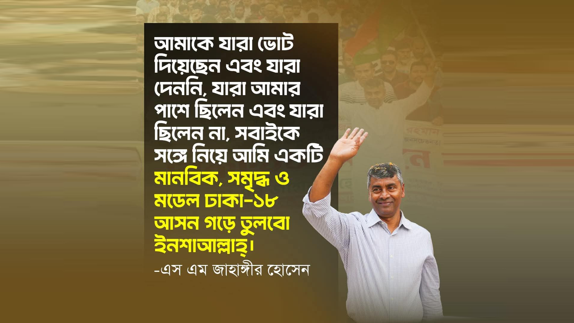 ঢাকা-১৮ আসনের নবনির্বাচিত সংসদ সদস্য এস এম জাহাঙ্গীর হোসেন বলেছেন, নির্বাচনে যারা তাকে ভোট দিয়েছেন কিংবা দেননি—সবাইকে নিয়েই তিনি একটি মানবিক, সমৃদ্ধ ও মডেল ঢাকা-১৮ আসন গড়ে তুলতে চান।
