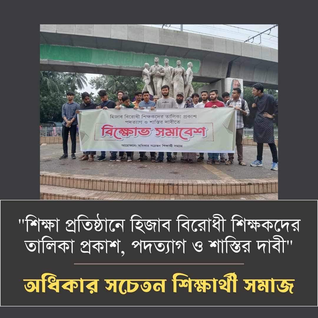 রাজু ভাস্কর্যের সামনে মানবন্ধনে শিক্ষার্থীরা। শিক্ষাপ্রতিষ্ঠানে হিজাব বিরোধী ১০০ শিক্ষকের তালিকা প্রকাশ করলো শিক্ষার্থীরা। তাদের বিরুদ্ধে আইনানুগ ব্যবস্থা গ্রহন করে শাস্তির দাবি শিক্ষার্থীদের।