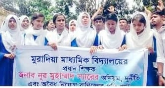 পটুয়াখালী জেলার দুমকি উপজেলার মুরাদিয়া মাধ্যমিক বিদ্যালয় নানান অনিয়ম, দূর্ণীতি ও নিয়োগ বাণিজ্যতে অভিযুক্ত প্রধান শিক্ষক নুর মোহাম্মদ এর অপসারণ দাবিতে মানববন্ধন ও প্রতিবাদ বিক্ষোভ করেছে প্রতিষ্ঠানটির শিক্ষার্থীরা। ২৭ আগস্ট বেলা সাড়ে ১১টায় উপজেলার মুরাদিয়া মাধ্যমিক বিদ্যালয়ের প্রধান শিক্ষক মো: নূর মোহাম্মদের অপসারণ দাবিতে ওই প্রতিষ্ঠানের শিক্ষার্থীরা স্কুল সংলগ্ন সড়কে দেড়ঘন্টা ব্যাপী প্রতিবাদ বিক্ষোভ ও মানববন্ধন কর্মসূচি পালন করেছে। বিক্ষুব্ধ শিক্ষার্থীরা জানায়,নানা অজুহাতে অফিসের নাম করে স্কুলে অনুপস্থিতি, গোপনে সুবিধামতো অনুগত কমিটি গঠনসহ বিভিন্ন অনিয়ম-দূর্ণীতি ও নিয়োগ বাণিজ্যের কারণে শিক্ষার পরিবেশ ধ্বংস হতে চলছে । এসব অনিয়ম দূর্ণীতির হোতা প্রধান শিক্ষক নূর মোহাম্মাদকে অপসারণ করে প্রতিষ্ঠানটিতে শিক্ষার পরিবেশ ফিরিয়ে আনার জন্য এলাকার সচেতন সাবেক শিক্ষার্থী, অভিভাবকগন শিক্ষা প্রশাসনের অতিদ্রুত হস্তক্ষেপ কামনা করেছেন। ওই বিদ্যালয়ের সহপ্রধান শিক্ষিকা মাহিনুর বেগম বলেন, কয়েকজন লোক এসে শিক্ষার্থীদের বাইরে ডেকে নিয়ে রাস্তায় দাড়াতে বাধ্য করেছে। কি কারনে কেন কিসের মানববন্ধন কিছুই তিনি জানেন না। মানববন্ধনকালে অভিযুক্ত প্রধান শিক্ষক বিদ্যালয়ে অনুপস্থিত ছিলেন। মোবাইল ফোনে অনিয়ম-দূর্ণীতি ও নিয়োগ বাণিজ্যের অভিযোগ অস্বীকার করে বলেন, স্থানীয় একটি চক্র অহেতুক তাকে হেনস্থা করতে কোমলমতি শিক্ষার্থীদের ব্যবহার করে রাস্তায় নামিয়েছে। উপজেলা মাধ্যমিক শিক্ষা অফিসার বদরুন্নাহার ইয়াসমিন বলেন, এইমাত্র খবরটি শুনেছেন। বিষয়টি জেলা শিক্ষা কর্মকর্তাকে অবহিত করবেন এবং তার নির্দেশনা অনুযায়ী পরবর্তি পদক্ষেপ নেয়া হবে। অন্তবর্তীকালীন সময়ের জন্য প্রতিষ্ঠানটির সভাপতির দায়িত্বরত উপজেলা নির্বাহি কর্মকর্তা মো: শাহীন মাহমুদ বলেন, ঘটনাটি অবগত হয়ে সেখানে পুলিশ ও সেনাবাহিনীর টিম পাঠিয়ে পরিস্থিতি নিয়ন্ত্রণে আনা হয়েছে এবং কারো কোন অভিযোগ থাকলে লিখিত আকারে (ইউএনও )বরাবর জানাতে বলা হয়েছে। #