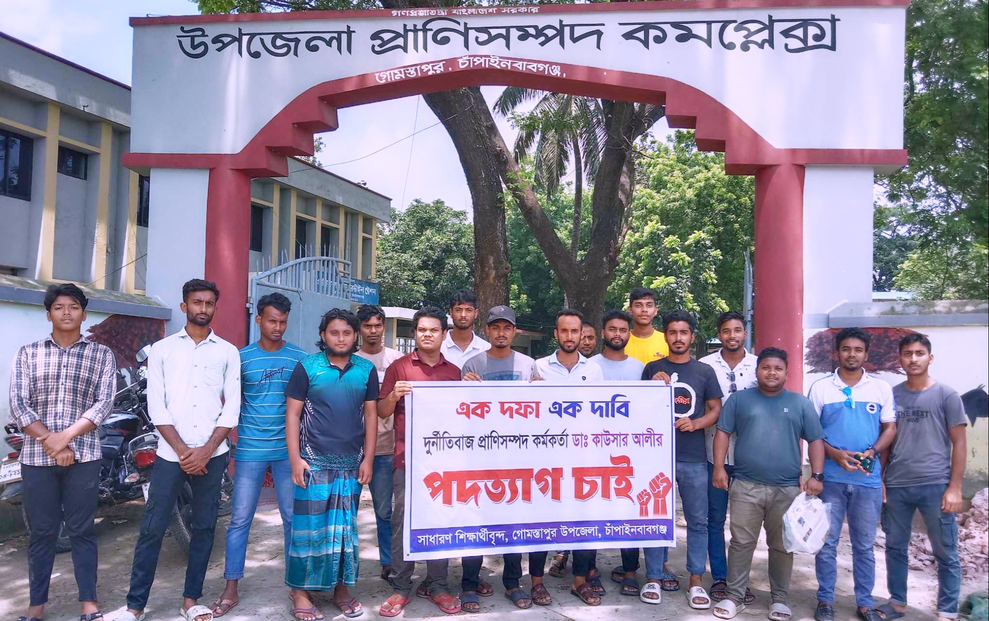 চাঁপাইনবাবগঞ্জের গোমস্তাপুরে উপজেলা প্রানিসম্পদ কর্মকর্তা ডাঃ কাউসার আলিকে অপসারনের দাবিতে মানববন্ধন করেছে সাধারণ শিক্ষার্থীরা।